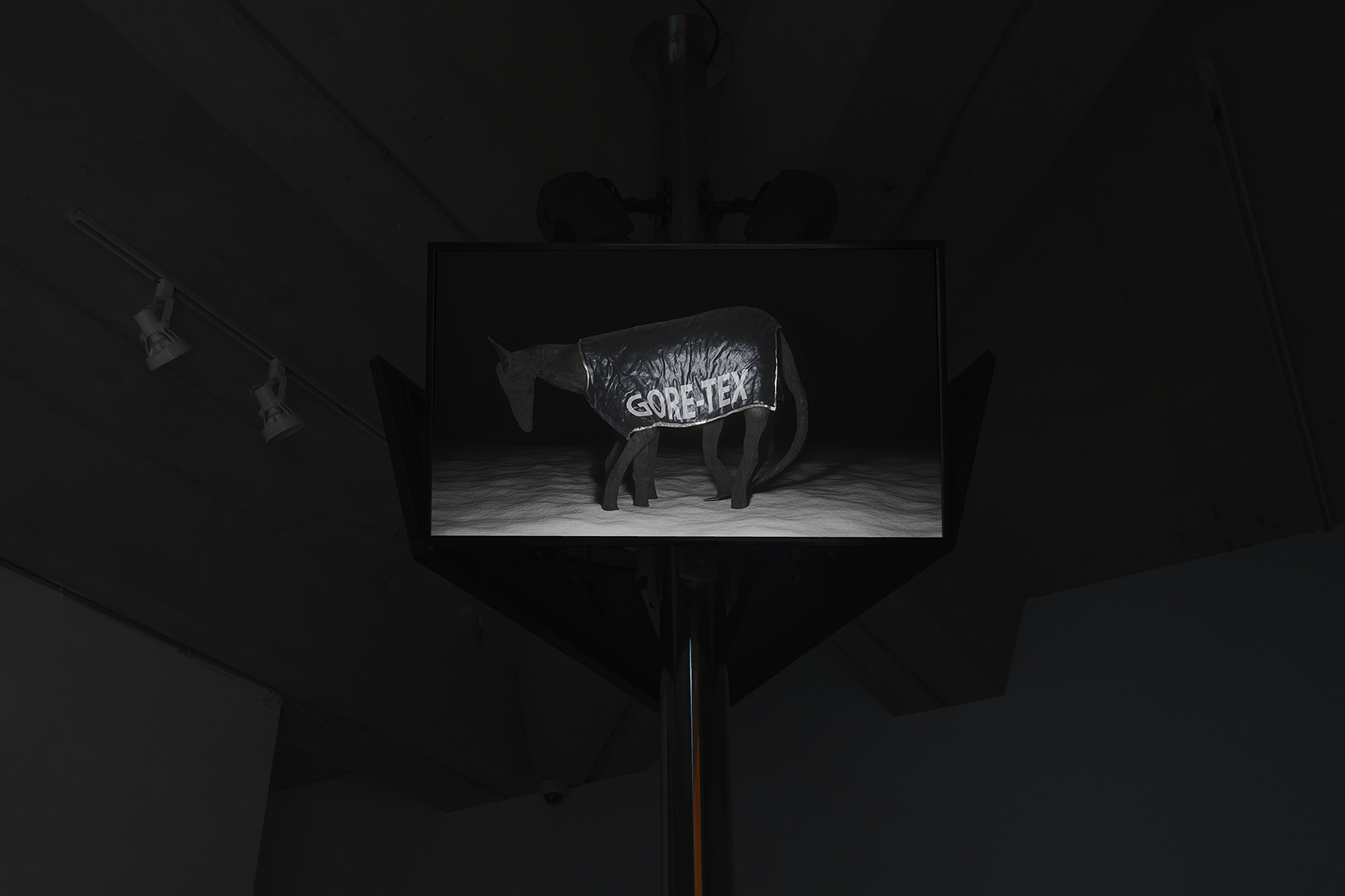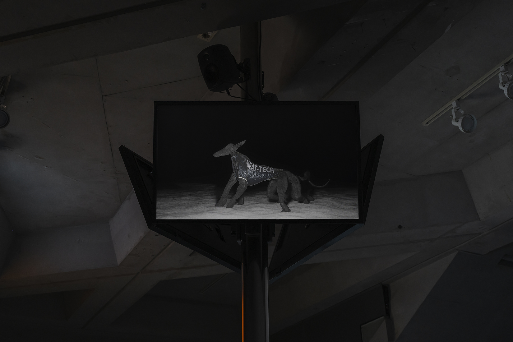 36.5°C, video installation with sound, two Genelec 8010A speakers, three 32-incheTV screens, round steel bar: H/4m70cm, D/11cm, 2024