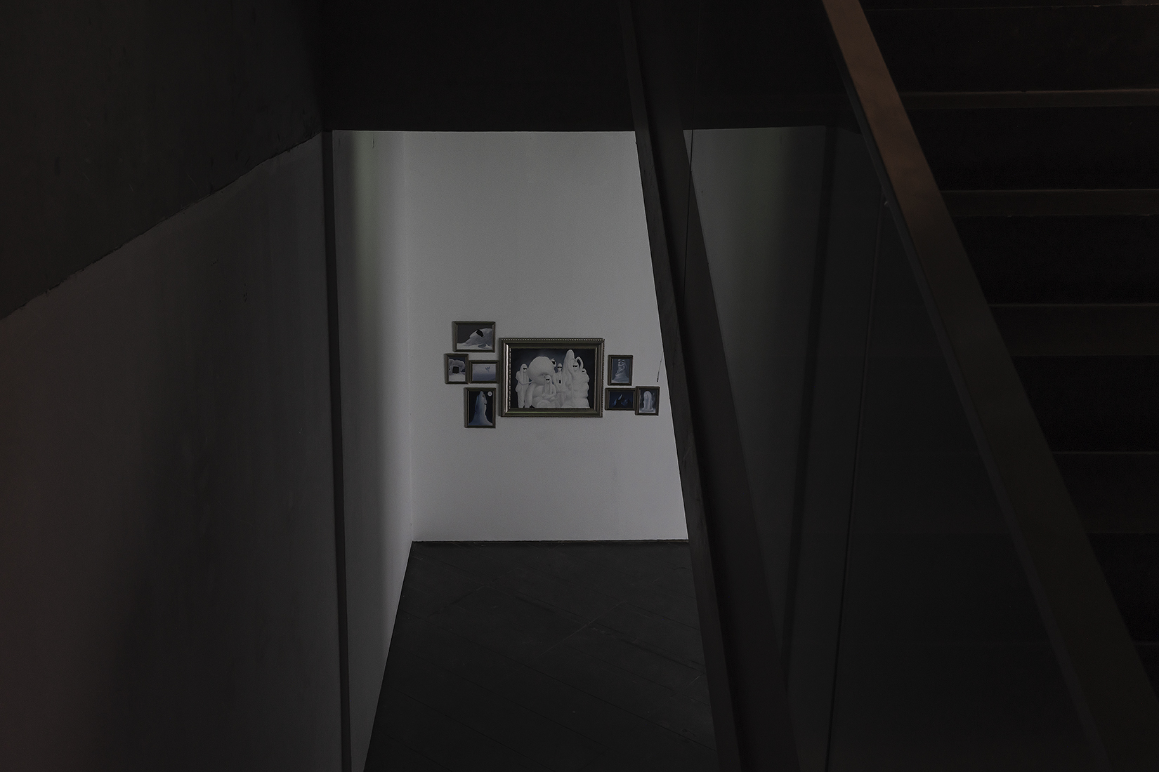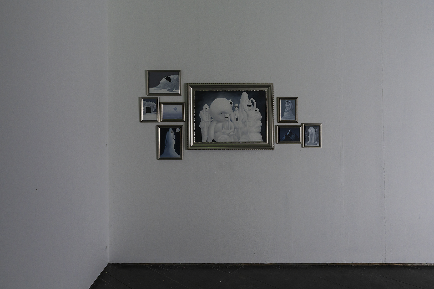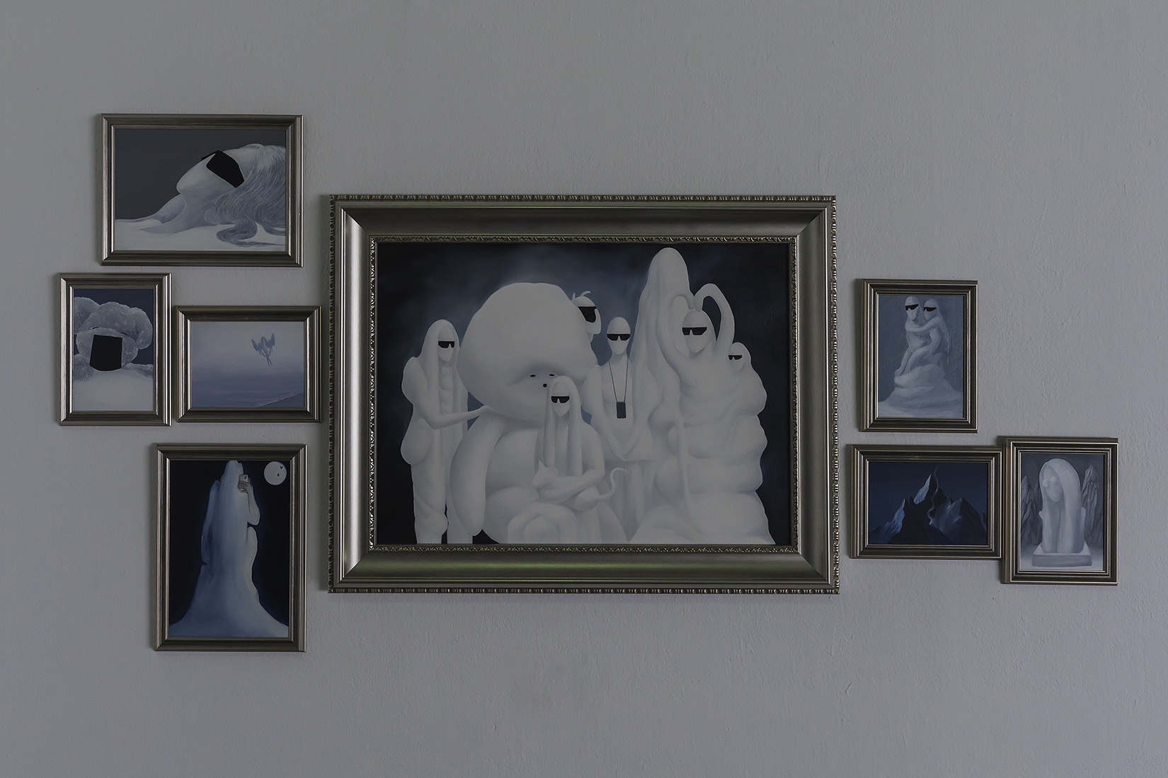 The black-and-white painting series KIM-CHI(2024) depicts characters from the animation gathered with an indifferent presence. This work is connected to the RGB Highway trilogy, extending the animated figures into a painterly form.