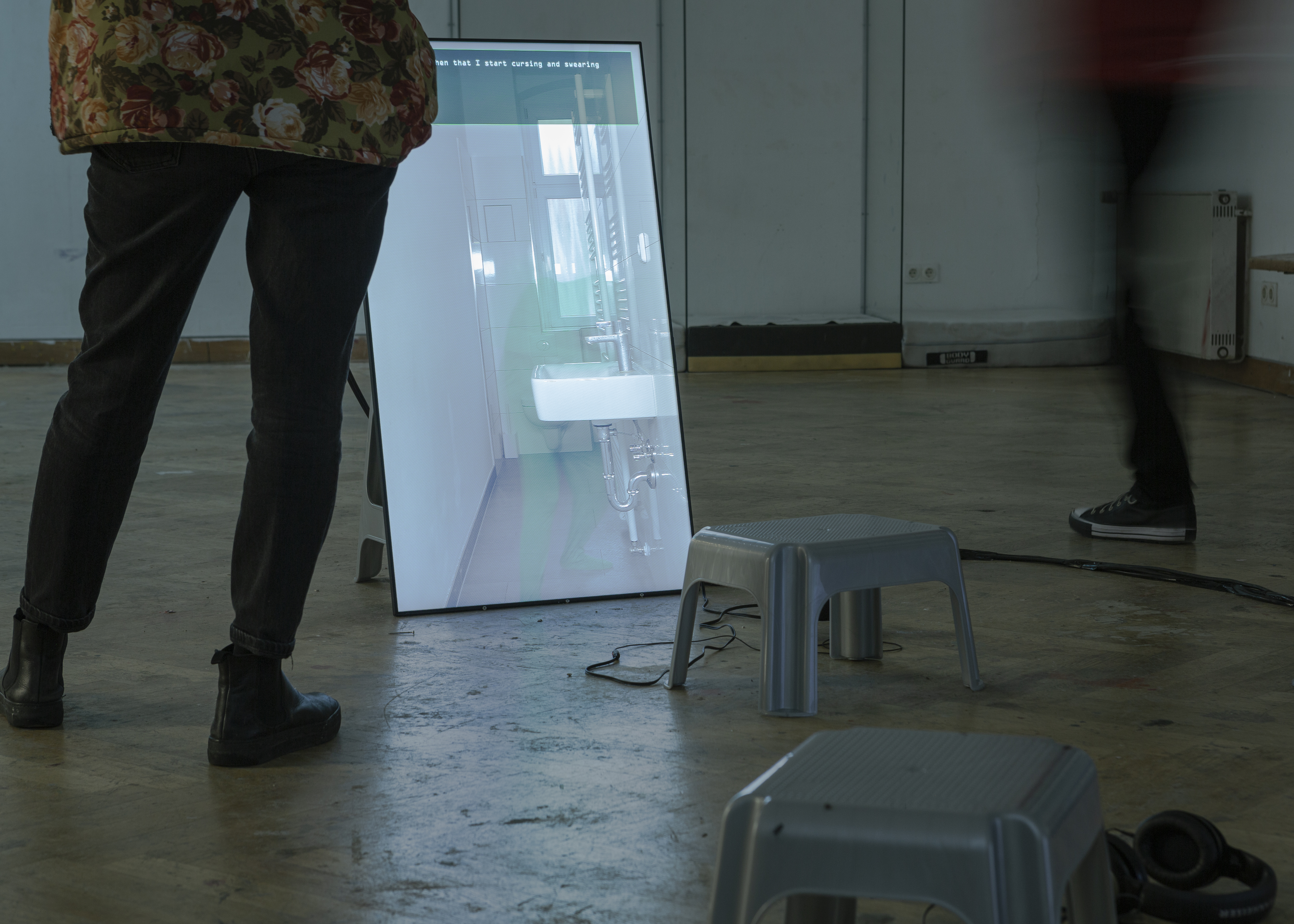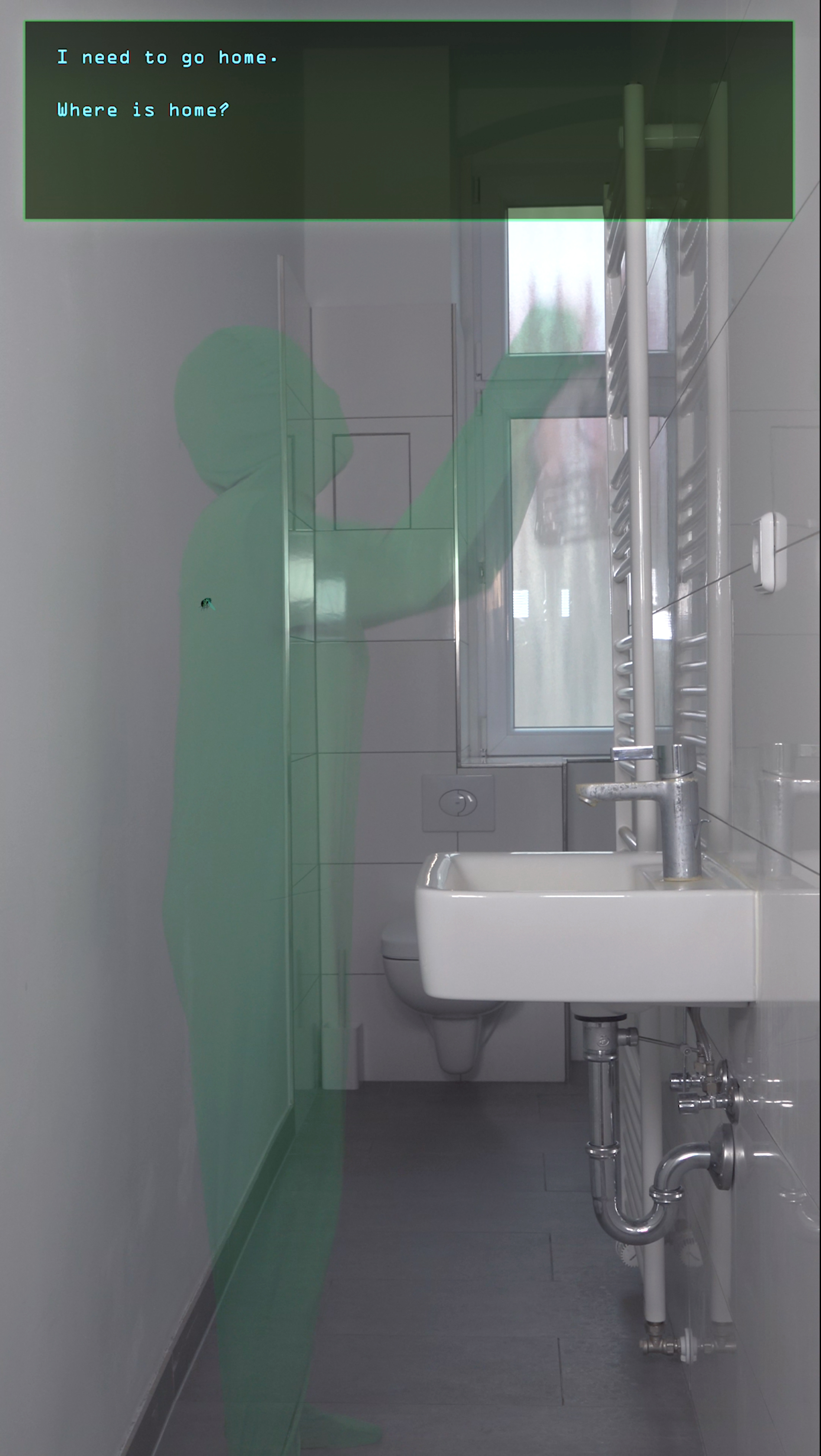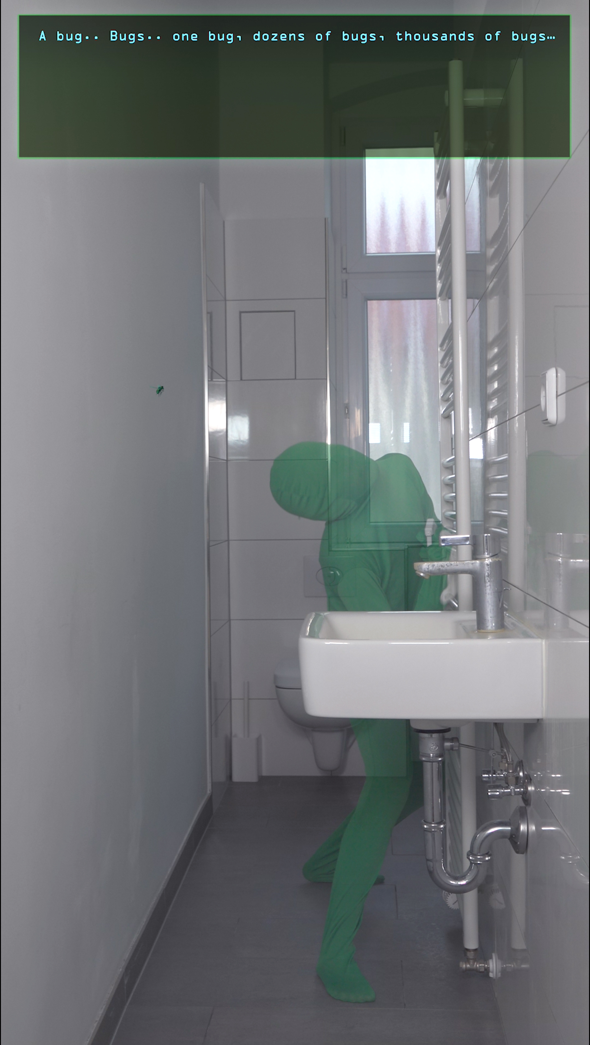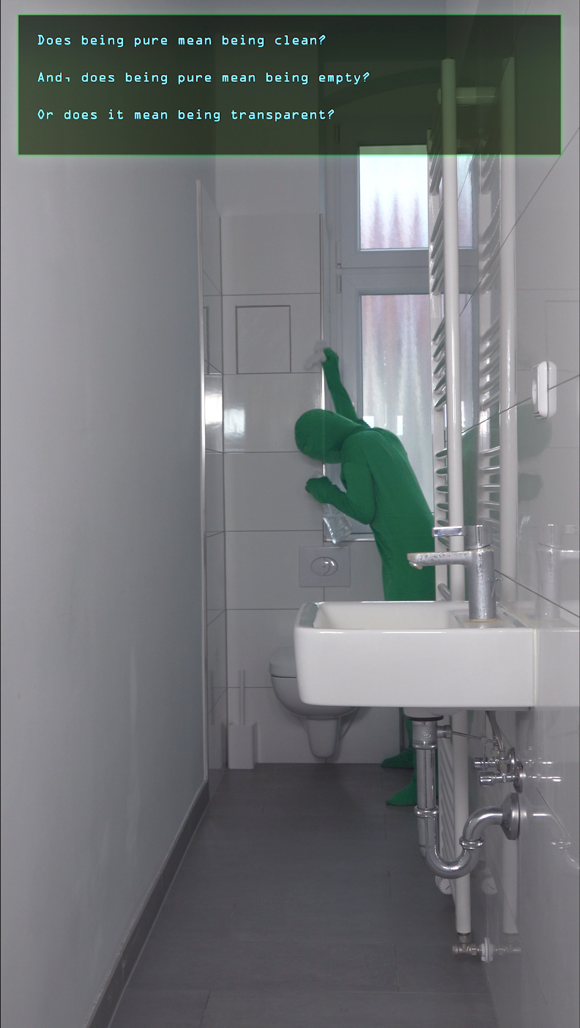 The Green Human Ver. is a vertical video work characterised by a recurring structure through an endlessly looping format. In the video, the protagonist continually cleans a bathroom, but paradoxically, there is no change in the cleanliness of the space despite their efforts. The scene seems to metaphorically float meaninglessly through time. The protagonist is unable to escape their immutable, fateful path, repeatedly disappearing and reappearing, metaphorically representing a fundamental issue that exists beyond boundaries and remains unresolved through generations.